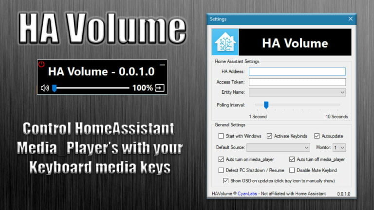 Just like VSX Volume, HA Volume hijacks the volume control keys (Vol Up, Vol Down, Mute) to control your Home Assistant media_player entity via the HA RESTful API