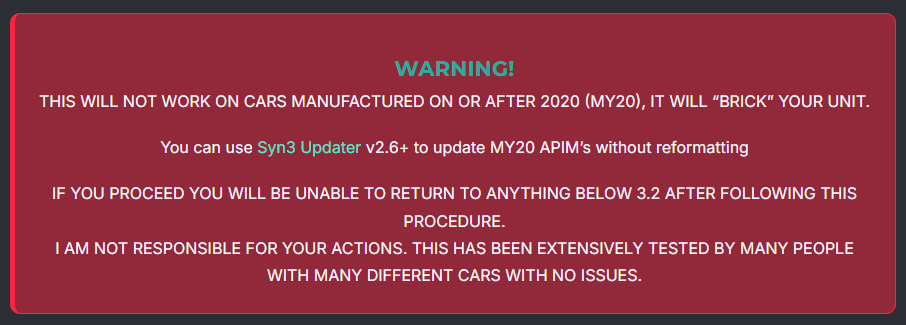 Its this line on the Cyanlabs website that confused me “You can use Syn3 Updater v2.6+ to update MY20 APIM’s without reformatting.”