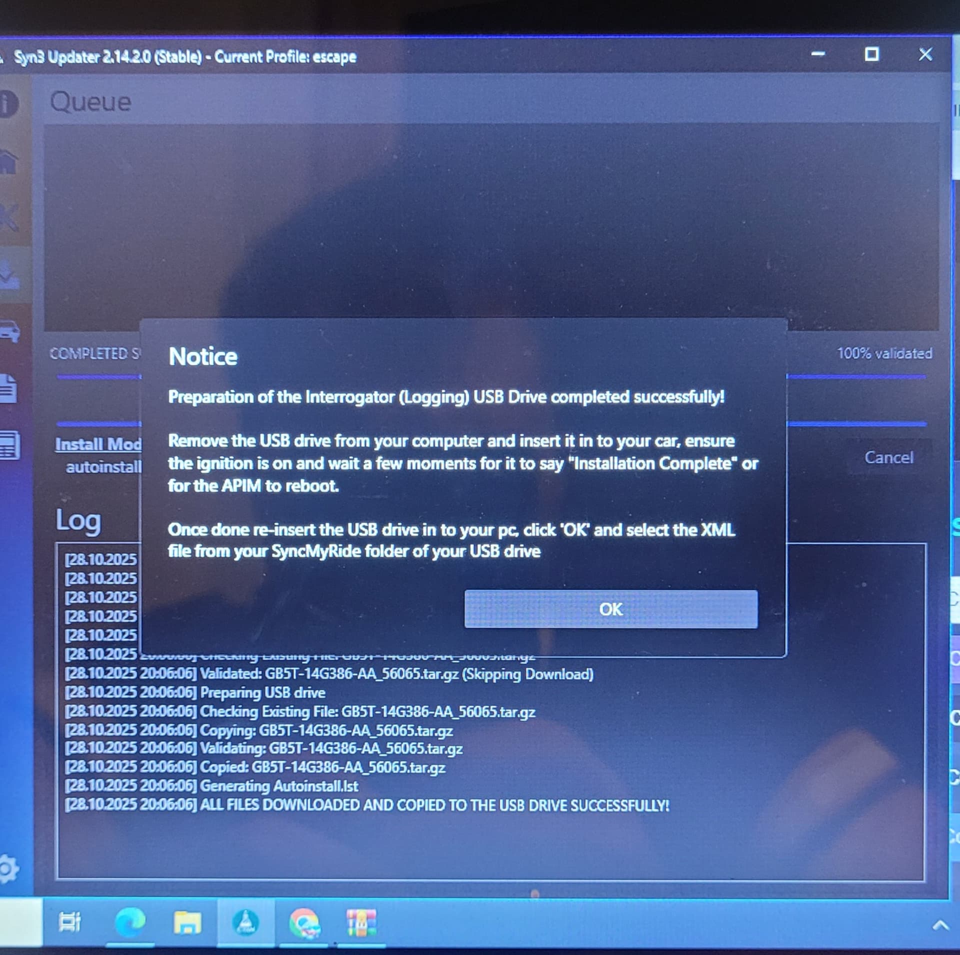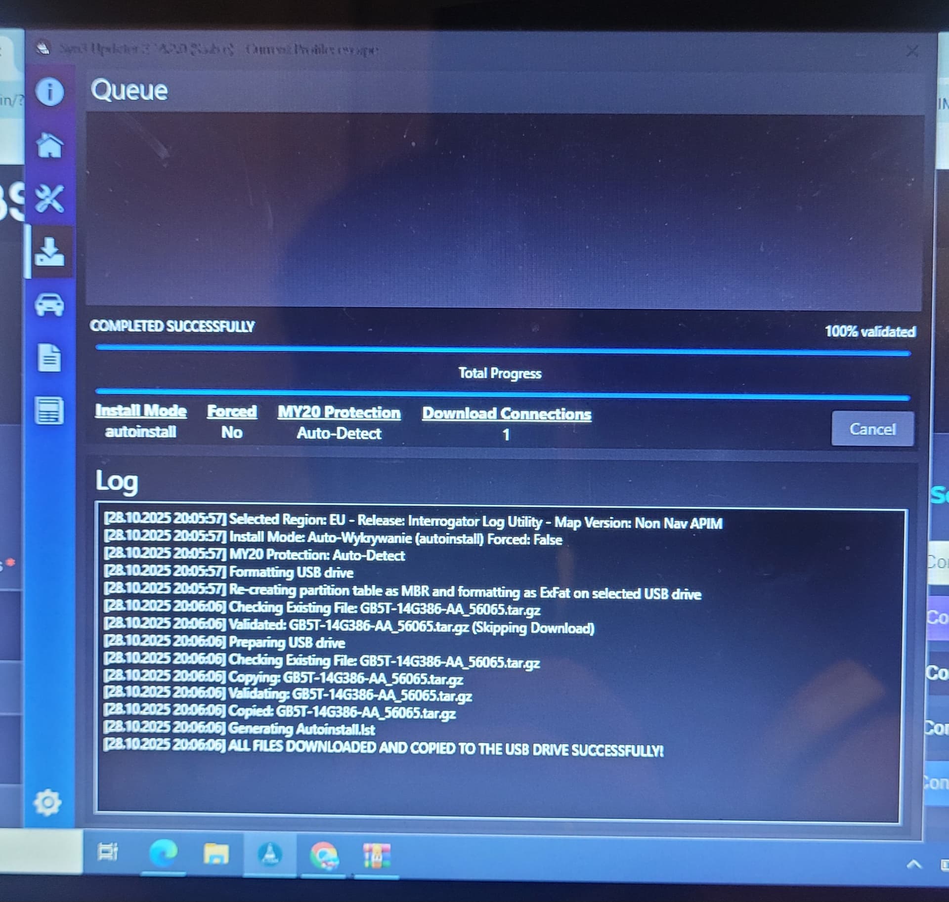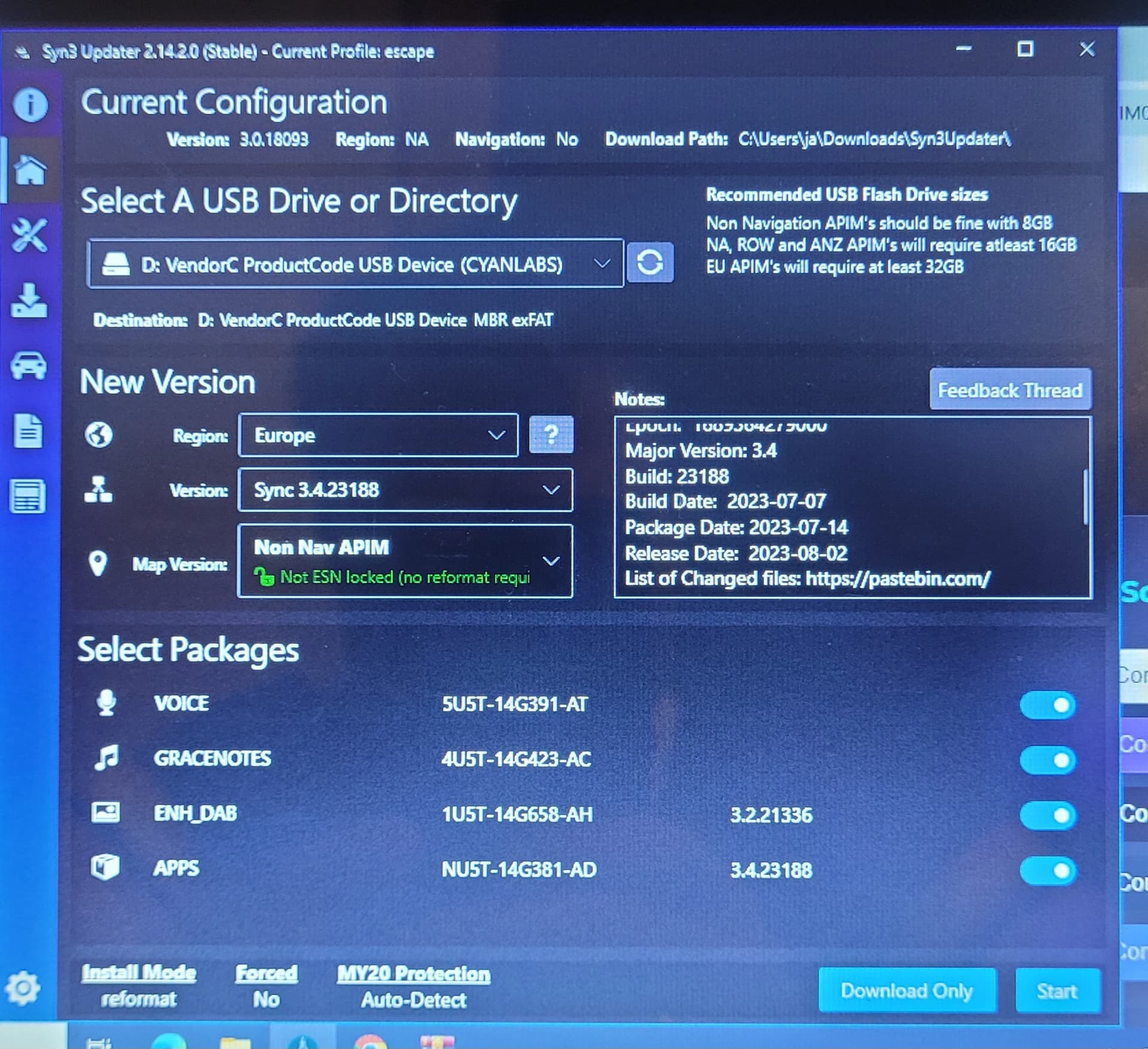 Hello. I want to update Sync 3.0 to 3.4 without navigation in a 2018 Ford Escape. I’ve already done this in my other Ford, and everything went according to the instructions. There seems to be a problem here. I’m doing everything as shown in the pictures. I need to change the region from USA to EU. I start creating a flash drive, and it takes a very short time, about 3 seconds, and I get a message that the process was successful. I think it should take about 15 minutes. The flash drive is almost empty, and it should take up about 8GB. I haven’t tried inserting the flash drive into the car.