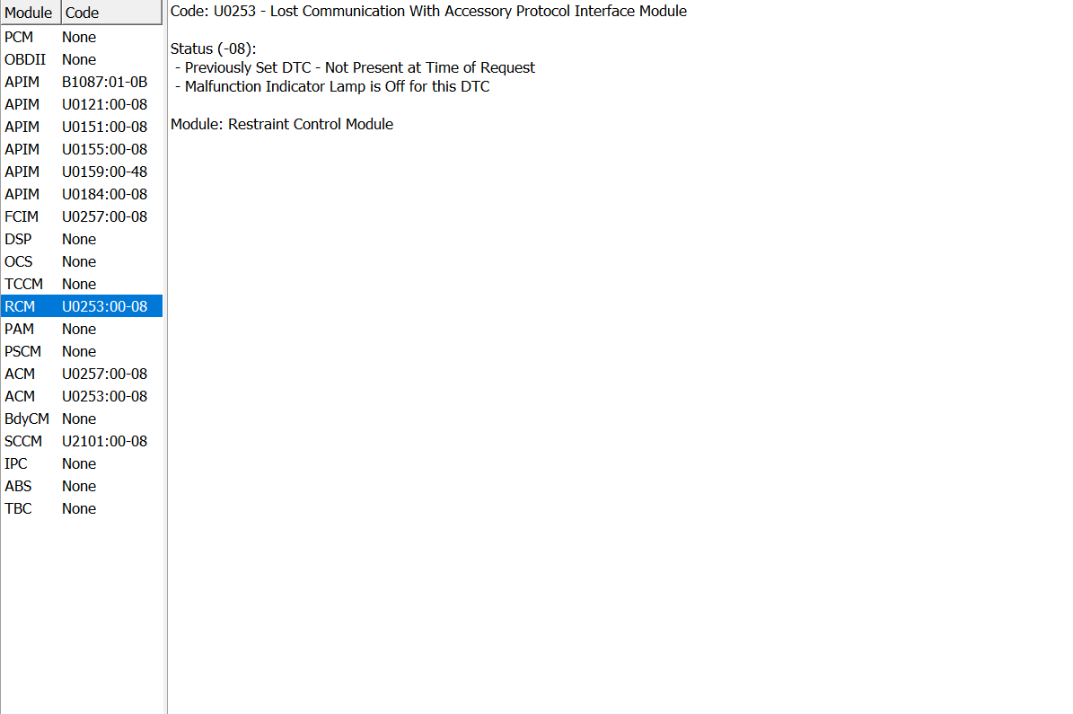 sorry for the book Ok here is my current AB & DTCs. RCM, ACM, SCCM codes just showed up they weren’t there yesterday which makes more sense as to my config being off, my question is then what settings do I need to use? like am I trying to program the APIM to MY truck or am I trying to trick it into thinking its working properly? And what modules do I not need to worry about? my truck is a 2013 F150 FX4 so it has the park sensors, remote start, heated and cooled seats, stuff like that but not so much some of fancy sensors newer fords come with.
